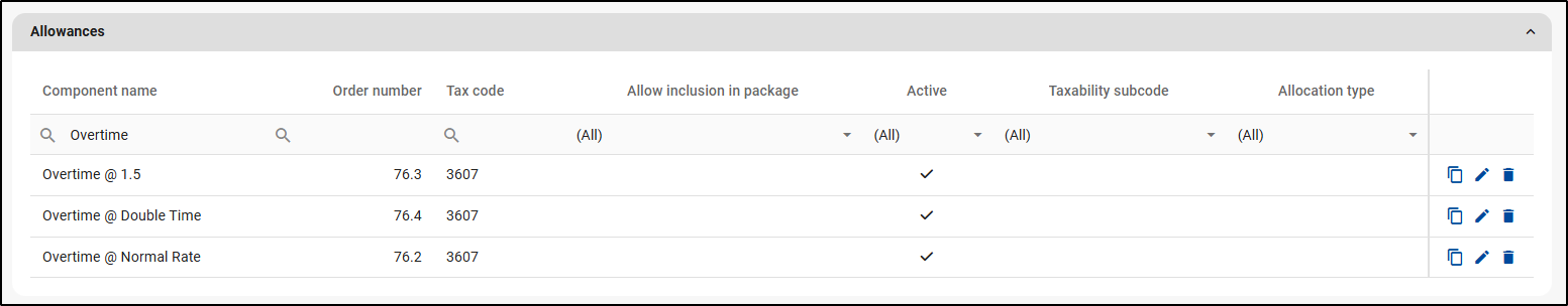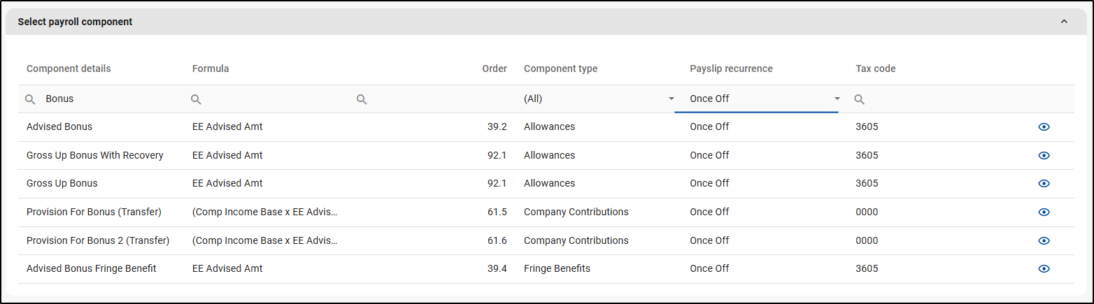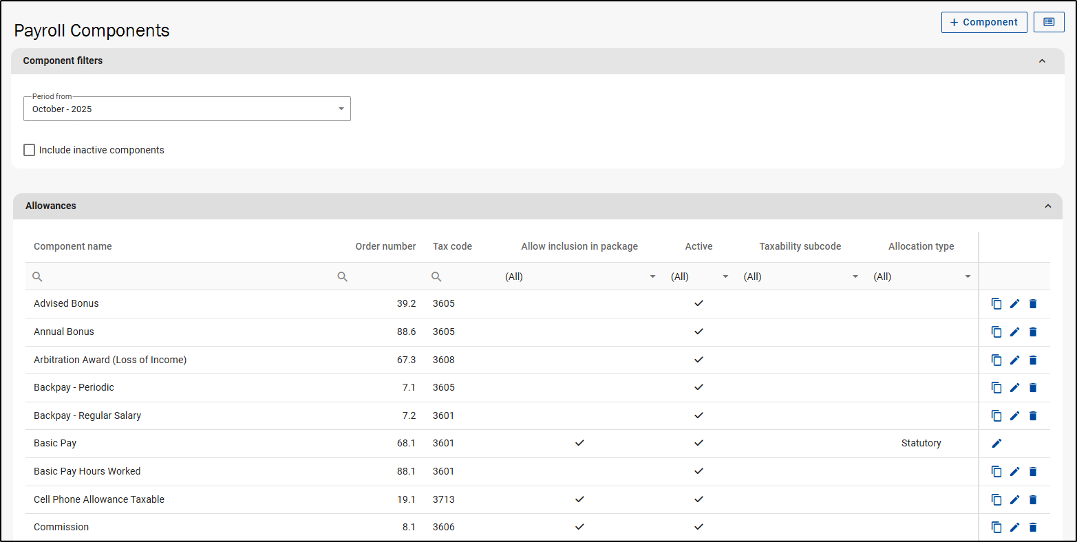 - Add new Component button – The Classic hyperlink to add a payroll component has been replaced with a button where the catalogue of available components is sorted into a grid that offers search and filter capabilities in each column.