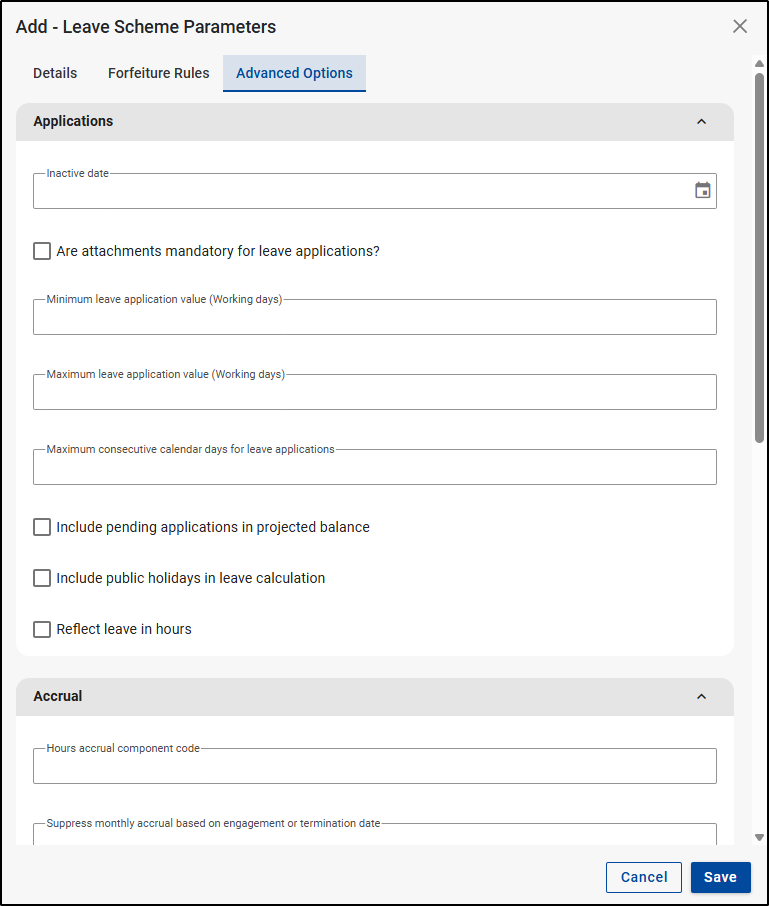 - Leave Type Configuration – configuration options are now accessible through a sleek slide-out menu that’s organised into these tabs: Details, Proration, Forfeiture Rules, and Advanced Options.