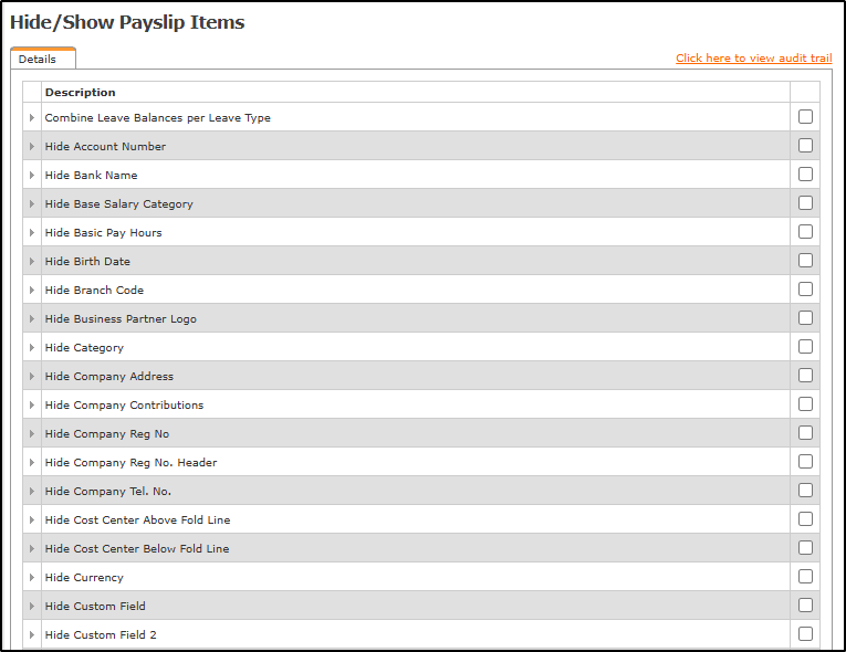 - To show or hide a payslip item, tick the checkbox next to the corresponding item.