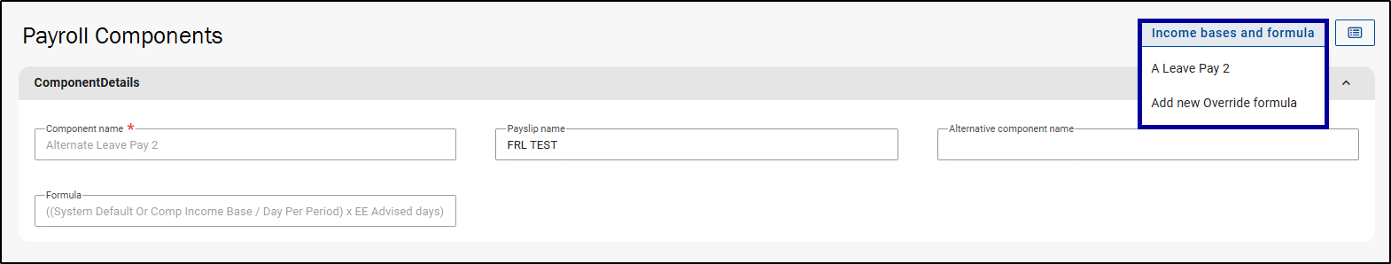 - Income Base Button – An Income Base button is now available in the top-right corner of the screen. If a formula is associated with a component, the formula name will be displayed first. Below it, users will have the ability to add an override formula where needed.