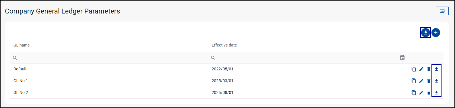 - General Ledger Report Download – A download icon is used to download General Ledger setups.